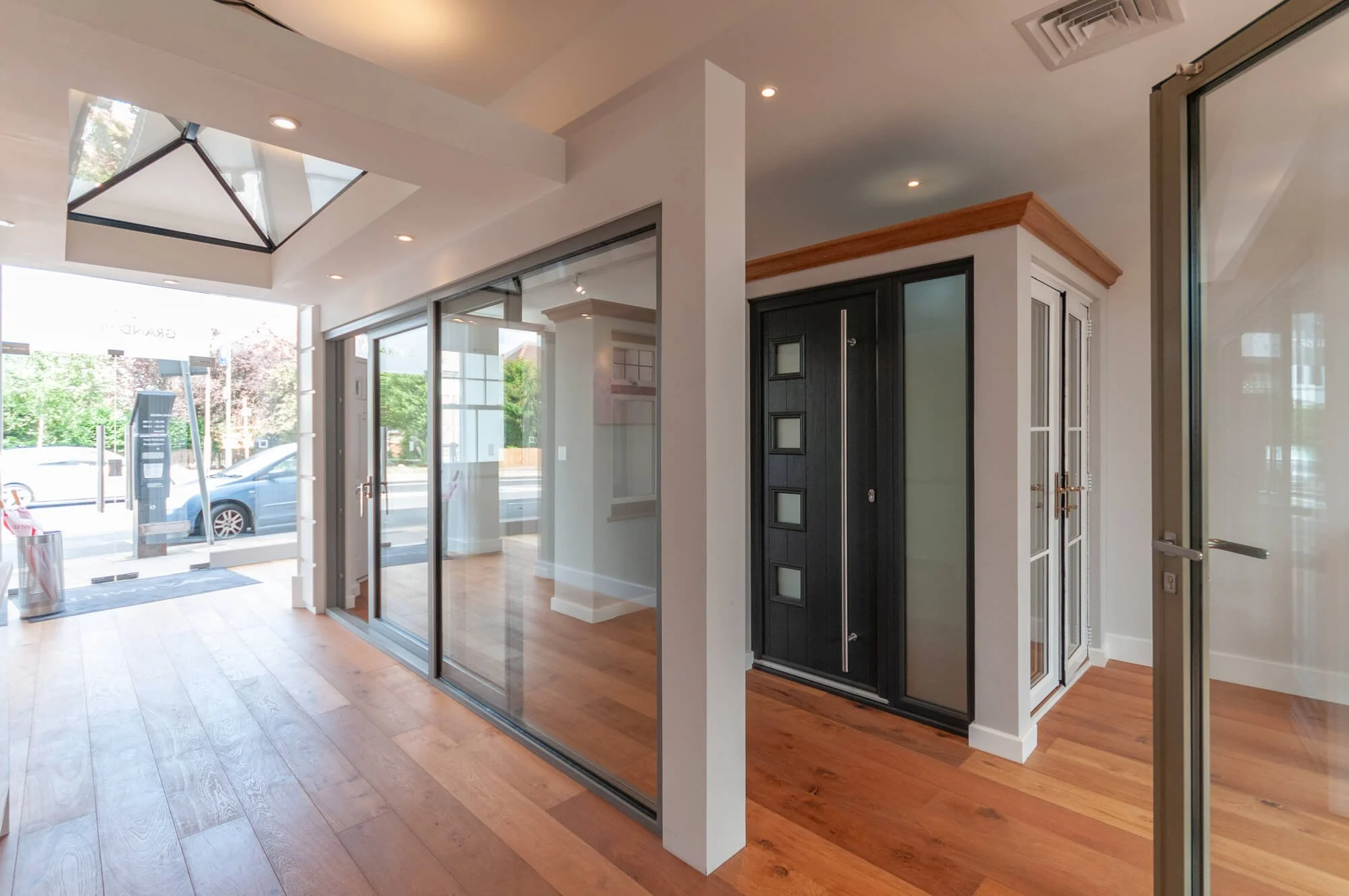 Stunning use of the Renolit ‘Anteak’ woodgrain foil finish. Flush casement windows, entrance doors and stable door with a single horizontal astragal bar throughout.